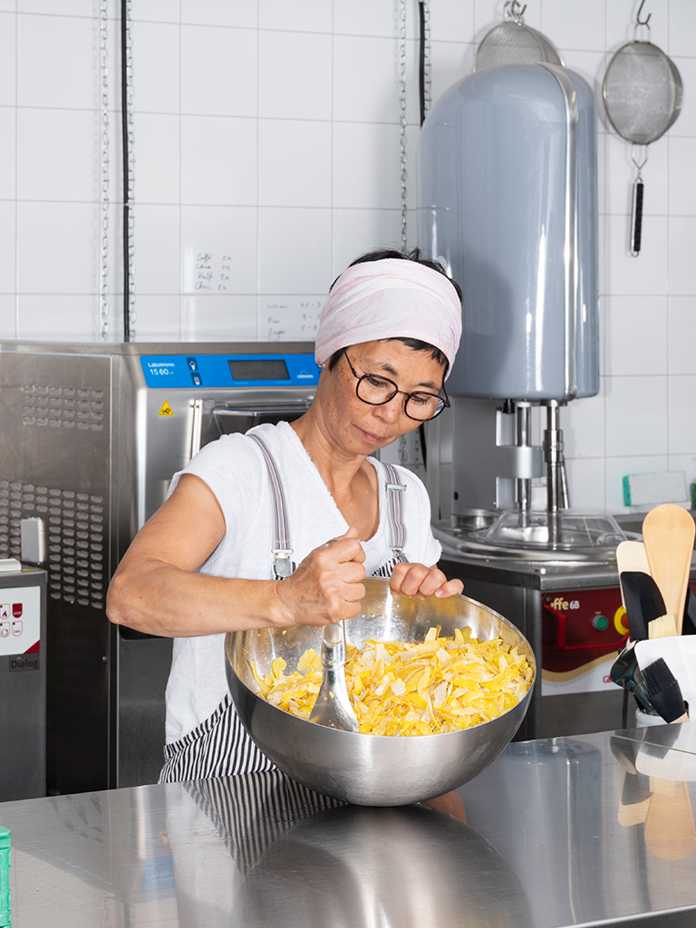 En 2010, elle entame une aventure enrichissante auprès de Luigi, artisan glacier de l’enseigne Gelateria 1900 à Lausanne. Entre eux, naît une complicité et une envie de partager cette parcelle étincelante d’Italie, pour la transmettre à travers les précieuses recettes de glaces qu’elle recueille et apprivoise.